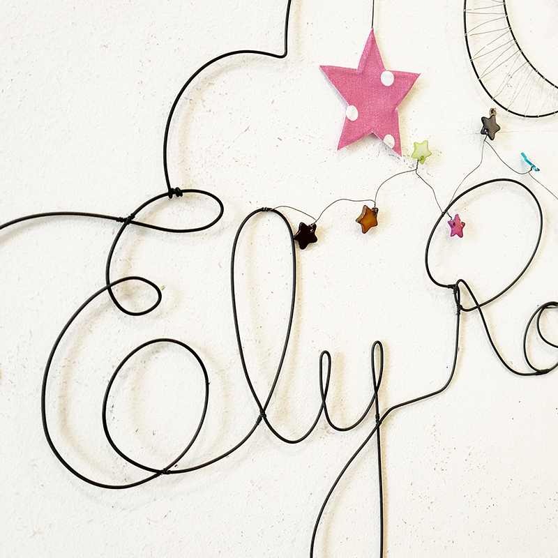 Prénom en fil de fer, dans un nuage d’étoiles dont deux, habillées de tissu. La lune et son fin crayonné donne le ton. Une petite fée habillée de tissu vient saupoudrer le prénom de petites étoiles en nacre.